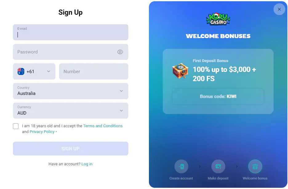 It is easy to register in the mobile version of Koru Casino. As it has been designed to function the same through browser play, all you need to do is:
