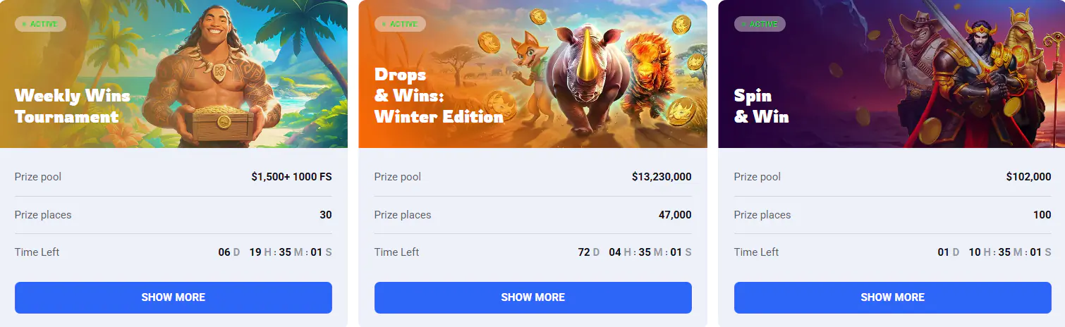 Do you crave the battle against other players? For a competitive experience, enter the arena and compete against other players at Koru Casino. Work your way through the various rounds, climb the leaderboard, and gain the perks, bonuses, and cash winnings. You can currently play the ‘Weekly Wins Tournament’ offering a prize pool of $1,000 and 1000 free spins, ‘Spinoleague 2025’ with a $12,000,000 prize pool, and ‘Heart of Volcano’ with a prize pool of $300,000.